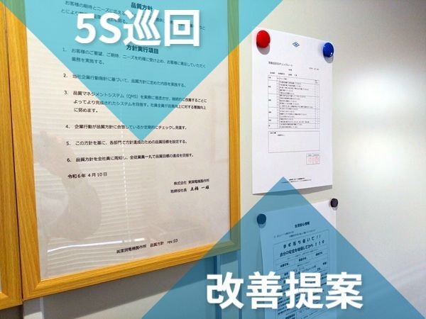 月に1度 5S巡回 を実施しています。社内規定に基づき、5S(整理・整頓・清掃・清潔・しつけ)が適切に実践されているかを確認しています。巡回結果は社内掲示板にて共有され、全社員が現状を把握できるようになっています。